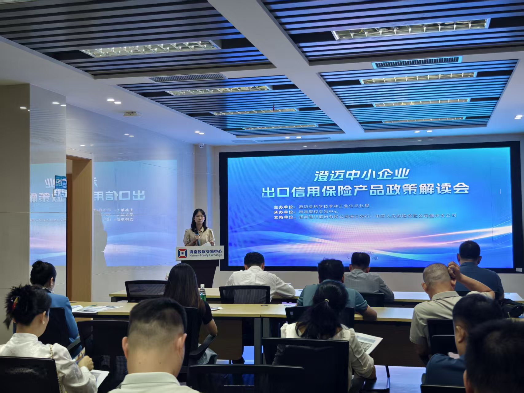 2025年11月11日下午,澄邁縣科學(xué)技術(shù)和工業(yè)信息化局舉辦“中小企業(yè)出口信用保險產(chǎn)品政策解讀會”,旨在幫助當(dāng)?shù)刂行∑髽I(yè)應(yīng)對日益復(fù)雜的國際貿(mào)易環(huán)境,提升風(fēng)險防控能力,增強跨境經(jīng)營信心。活動由海南股權(quán)交易中心承...