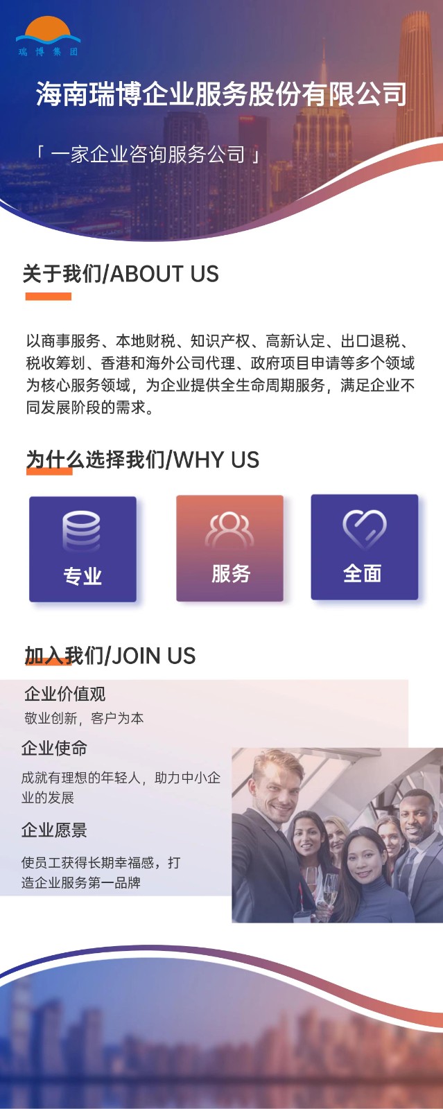| 企業(yè)說明: | 海南瑞博企業(yè)服務(wù)股份有限公司是瑞博集團(tuán)下屬子公司,自2018年海南自貿(mào)港開放以來。瑞博集團(tuán)積極響應(yīng)國家的號召,通過充分考察后,于海南省海口市成立海南瑞博企業(yè)服務(wù)股份有限公司,主要以商事服務(wù)、本地財(cái)稅、知識產(chǎn)權(quán)、高新認(rèn)定、出口退稅、稅收籌劃、香港和海外公司代理、政府項(xiàng)目申請等多個(gè)領(lǐng)域?yàn)楹诵姆?wù)領(lǐng)域,為企業(yè)提供全生命周期服務(wù),滿足企業(yè)不同發(fā)展階段的需求。 瑞博集團(tuán)下屬直營子公司分部在北京、西安、海南、香港等地,全國主要一二線城市的分部陸續(xù)成立中,跨區(qū)域配合,輻射全國,以滿足客戶跨區(qū)域服務(wù)需求;同時(shí)瑞博持續(xù)拓展延伸資源合作平臺,引入各類商業(yè)服務(wù)機(jī)構(gòu)供應(yīng)鏈合作機(jī)構(gòu),打通了產(chǎn)業(yè)鏈上下游領(lǐng)域的立體服務(wù)生態(tài),企業(yè)全品類服務(wù)能力,得到了廣大的客戶的認(rèn)可與信賴。 |