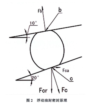 浮封環(huán)需成對使用,一個隨旋轉(zhuǎn)件旋轉(zhuǎn)(動環(huán)),另一個相對靜止(定環(huán)),在動環(huán)與浮封座之間以及在定環(huán)與浮封座之間的錐面處,各裝入一個具有圓形斷面的橡膠圈,在裝配預(yù)緊力作用下橡膠圈在浮封座形成的密封腔內(nèi)受軸向壓縮產(chǎn)生變形。產(chǎn)生垂直于浮封座錐面的彈力 Fb 和垂直浮封環(huán)錐面的彈力 Fc,彈力 Fc 分解為軸向分力 Fca 和徑向分力 Fcr。彈力 Fb 是橡膠圈與浮封座錐面緊密接觸實現(xiàn) b 處密封,彈力 Fc 是橡膠圈與浮封環(huán)錐面緊密接觸實現(xiàn) c 處密封,軸向分力 Fca 使兩浮封環(huán)密封面緊密接觸,實現(xiàn) a 處密封,最終實現(xiàn)整個密封系統(tǒng)的 5 處密封要求(見圖 2)。