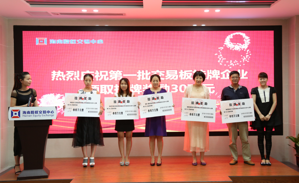 9月11日下午,海南股權(quán)交易中心掛牌企業(yè)獎(jiǎng)勵(lì)發(fā)放儀式在海南生態(tài)軟件園B13號(hào)舉辦。海口市財(cái)政局富天放副局長、企業(yè)處曾文麗處長和??谑薪鹑谵k馬濟(jì)淵副主任出席了活動(dòng),??谑惺着?0家交易板掛牌企業(yè)分別獲得了30萬元的財(cái)政獎(jiǎng)勵(lì)。