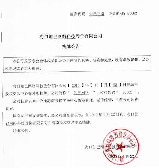 80082 海口知己網(wǎng)絡(luò)科技股份有限公司:摘牌公告
