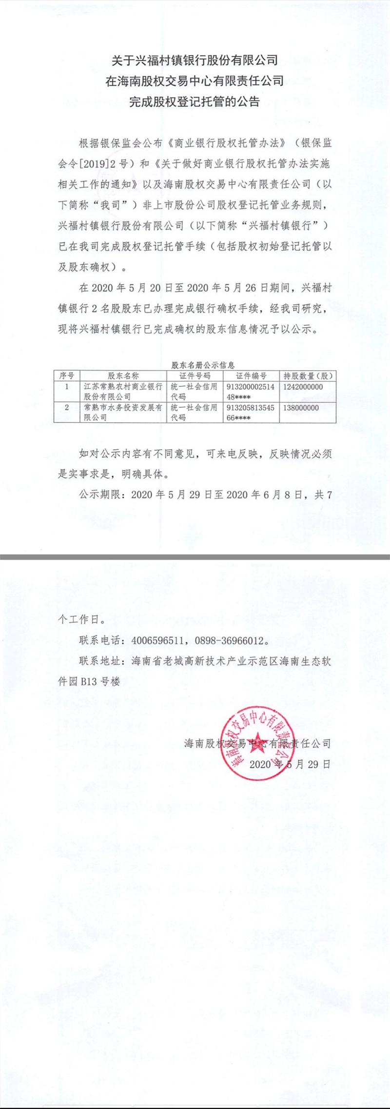 興福村鎮(zhèn)銀行股份有限公司在海南股權(quán)交易中心進(jìn)行股權(quán)登記托管的公告