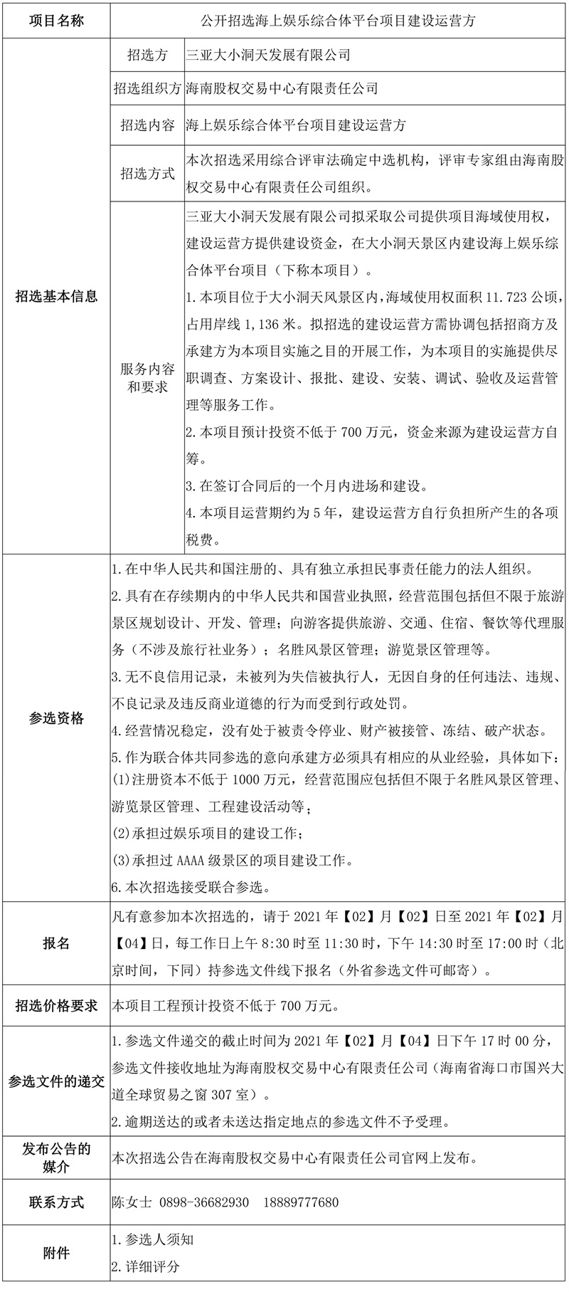 根據(jù)相關(guān)法律法規(guī),受委托,海南股權(quán)交易中心有限責(zé)任公司公開招選海上娛樂綜合體平臺項目建設(shè)運營方,為三亞大小洞天景區(qū)的海上娛樂綜合體平臺項目提供盡職調(diào)查、項目報批、建設(shè)、生產(chǎn)、安裝、調(diào)試、驗收及運營管理等服務(wù)工作。歡迎符合條件的機(jī)構(gòu)遵照本公告的有關(guān)規(guī)定報名參加,現(xiàn)將有關(guān)事項公告如下: