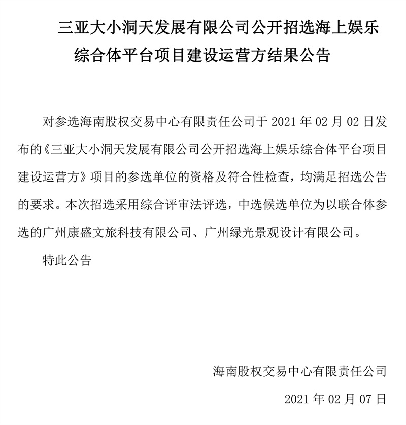 三亞大小洞天發(fā)展有限公司公開(kāi)招選海上娛樂(lè)綜合體平臺(tái)項(xiàng)目建設(shè)運(yùn)營(yíng)方結(jié)果公告