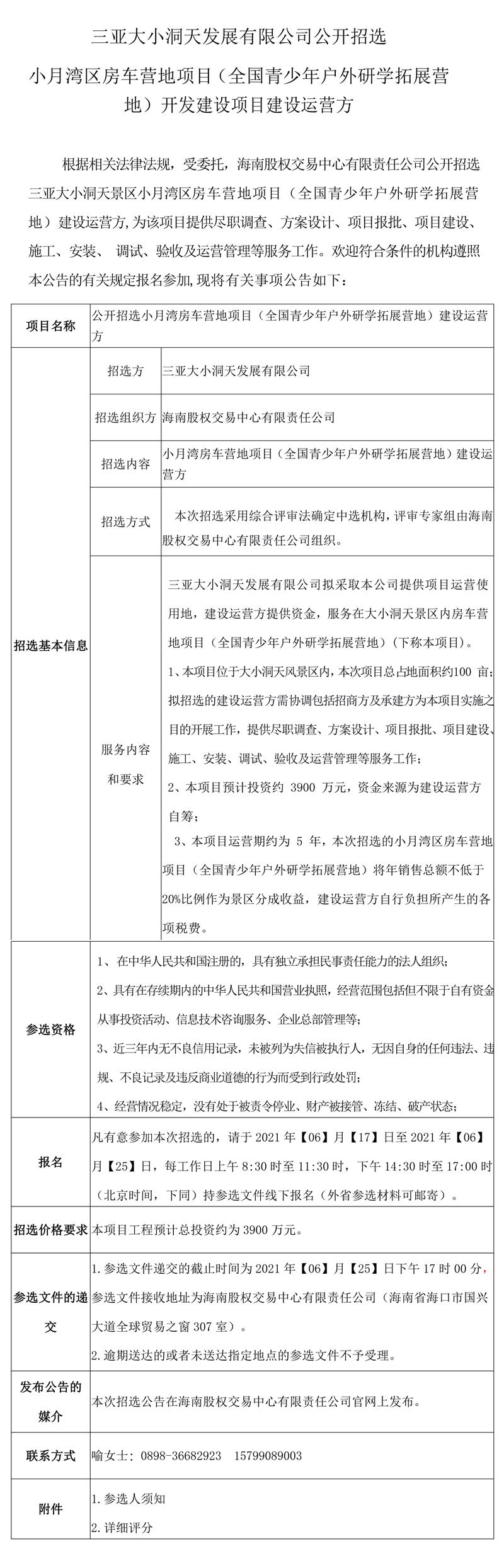 三亞大小洞天發(fā)展有限公司公開招選 小月灣區(qū)房車營地項(xiàng)目(全國青少年戶外研學(xué)拓展?fàn)I地)開發(fā)建設(shè)項(xiàng)目建設(shè)運(yùn)營方