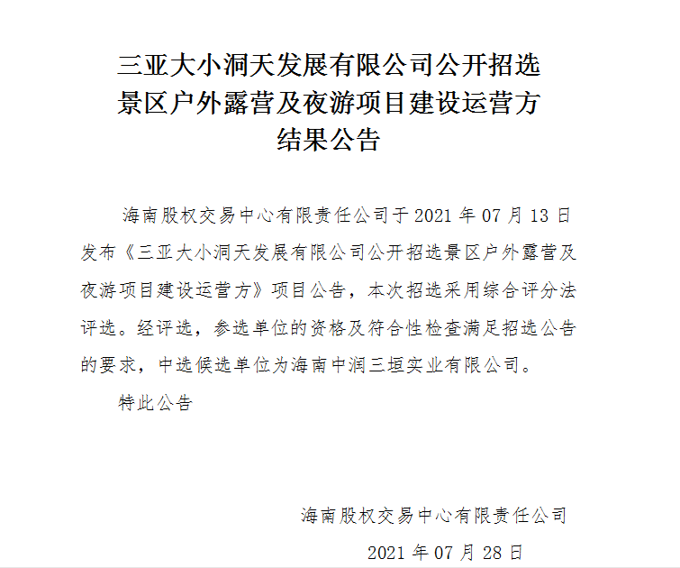 三亞大小洞天發(fā)展有限公司公開招選景區(qū)戶外露營(yíng)及夜游項(xiàng)目建設(shè)運(yùn)營(yíng)方結(jié)果公告