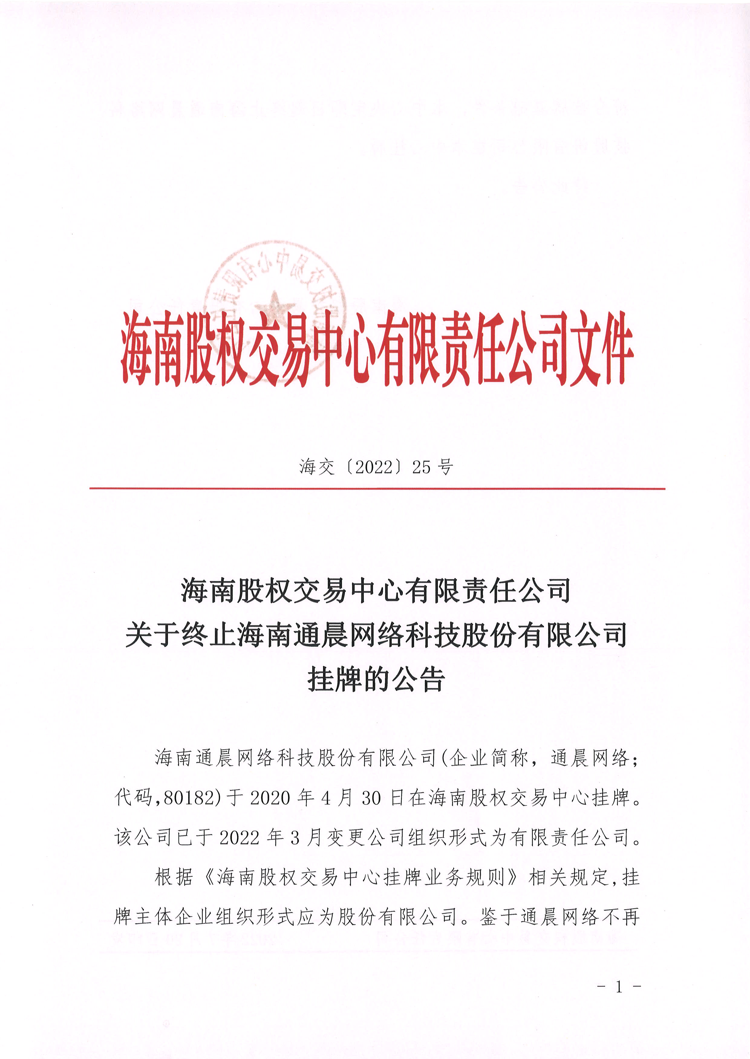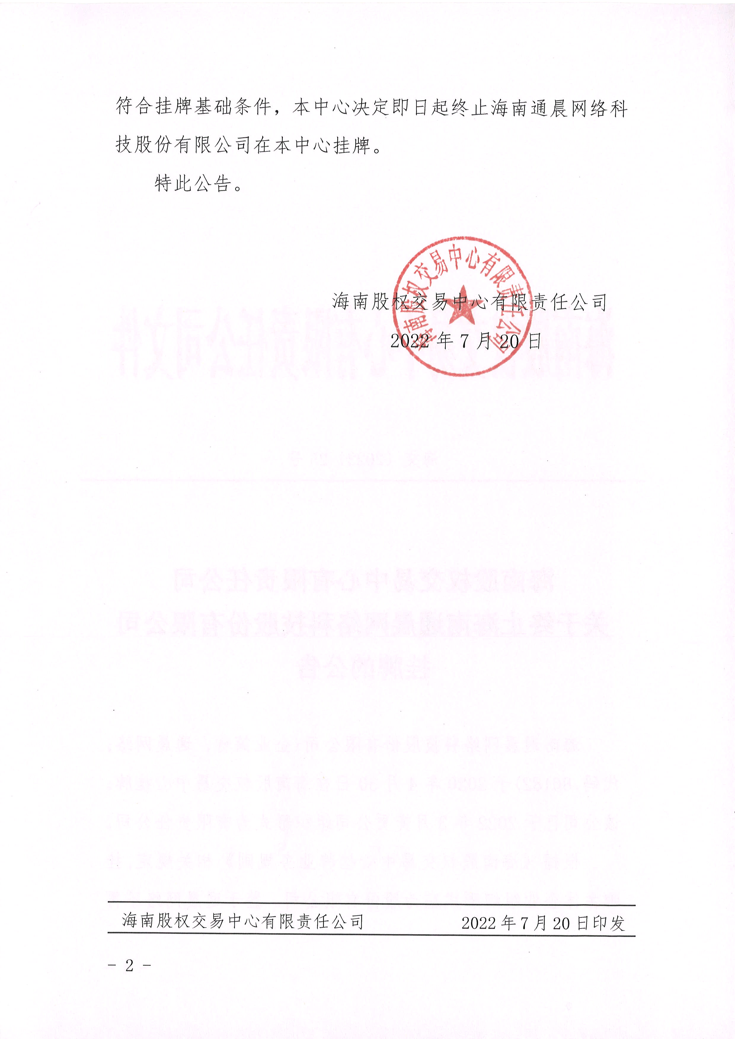 海南股權交易中心有限責任公司關于終止海南通晨網絡科技股份有限公司掛牌的公告