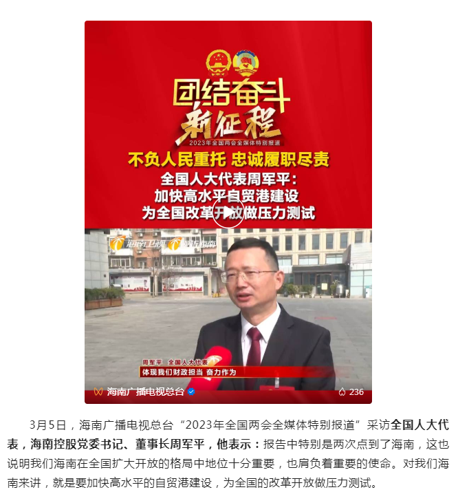 近日來(lái),新華社、經(jīng)濟(jì)參考報(bào)、海南日?qǐng)?bào)、海南廣播電視總臺(tái)等多家媒體,先后采訪了全國(guó)人大代表、海南控股黨委書記、董事長(zhǎng)周軍平,他圍繞高水平推動(dòng)海南自貿(mào)港建設(shè)、恢復(fù)和擴(kuò)大消費(fèi)、全島封關(guān)運(yùn)作“一號(hào)工程”等主題談體會(huì)、話發(fā)展。