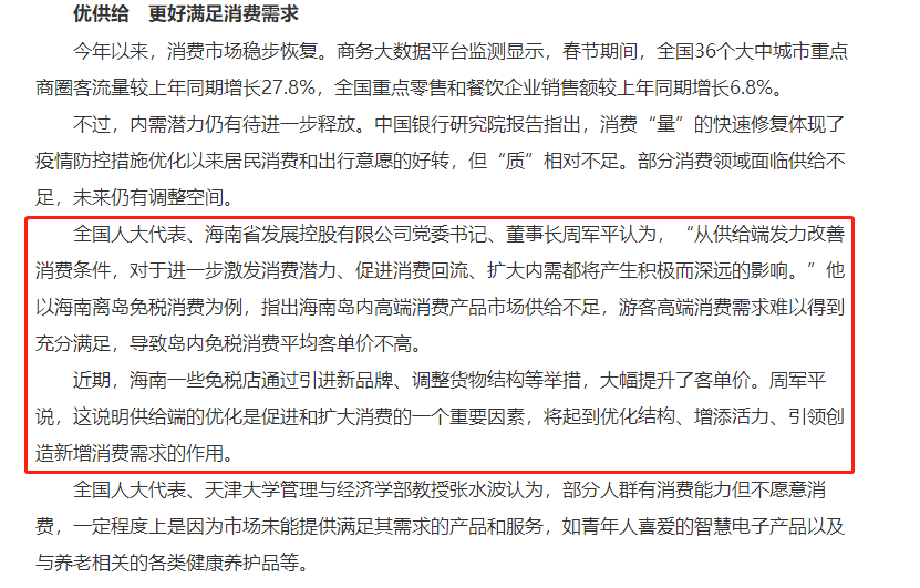 報(bào)道圍繞“如何讓消費(fèi)‘熱’起來(lái)?怎樣解決不便消費(fèi)、不愿消費(fèi)、不敢消費(fèi)等突出問(wèn)題以釋放消費(fèi)潛力?”采訪全國(guó)兩會(huì)代表委員。報(bào)道提及:全國(guó)人大代表、海南省發(fā)展控股有限公司黨委書記、董事長(zhǎng)周軍平認(rèn)為,“從供給端發(fā)力改善消費(fèi)條件,對(duì)于進(jìn)一步激發(fā)消費(fèi)潛力、促進(jìn)消費(fèi)回流、擴(kuò)大內(nèi)需都將產(chǎn)生積極而深遠(yuǎn)的影響?!彼院D想x島免稅消費(fèi)為例,指出海南島內(nèi)高端消費(fèi)產(chǎn)品市場(chǎng)供給不足,游客高端消費(fèi)需求難以得到充分滿足,導(dǎo)致島內(nèi)免稅消費(fèi)平均客單價(jià)不高。近期,海南一些免稅店通過(guò)引進(jìn)新品牌、調(diào)整貨物結(jié)構(gòu)等舉措,大幅提升了客單價(jià)。周軍平說(shuō),這說(shuō)明供給端的優(yōu)化是促進(jìn)和擴(kuò)大消費(fèi)的一個(gè)重要因素,將起到優(yōu)化結(jié)構(gòu)、增添活力、引領(lǐng)創(chuàng)造新增消費(fèi)需求的作用。