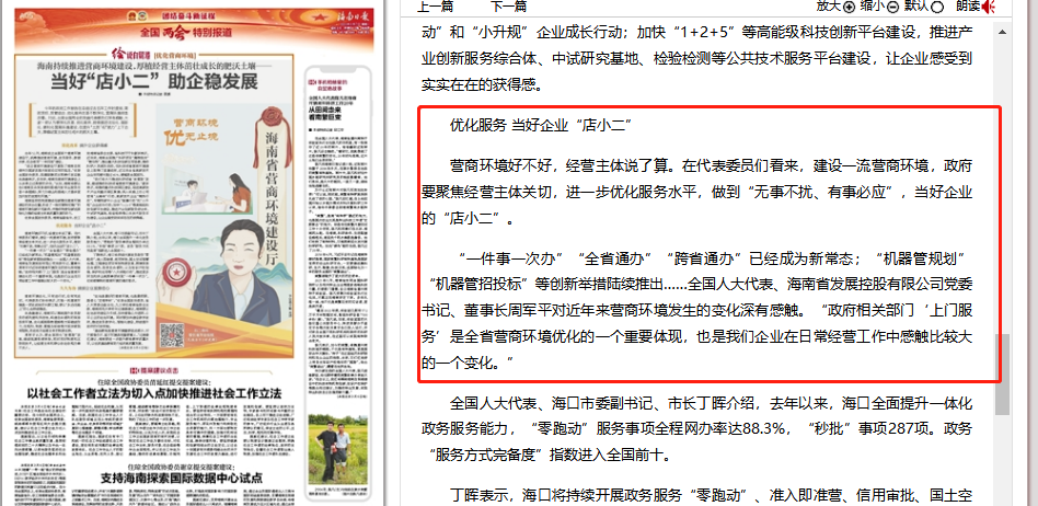 3月7日,海南日報發(fā)布文章《當(dāng)好“店小二”助企穩(wěn)發(fā)展—— 海南持續(xù)推進(jìn)營商環(huán)境建設(shè),厚植經(jīng)營主體茁壯成長的肥沃土壤》。文章指出:今年的政府工作報告在總結(jié)過去五年工作時提到,簡政放權(quán)、放管結(jié)合、優(yōu)化服務(wù)改革不斷深化,營商環(huán)境明顯改善。對此,出席全國兩會的我省代表委員們深有感觸。