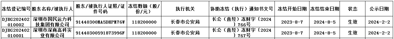 依據(jù)長(zhǎng)春市公安局《協(xié)助凍結(jié)財(cái)產(chǎn)通知書(shū)》[長(zhǎng)公(直經(jīng))凍財(cái)字〔2024〕766號(hào)]、[長(zhǎng)公(直經(jīng))凍財(cái)字〔2024〕767號(hào)],我中心為海口聯(lián)合農(nóng)村商業(yè)銀行股份有限公司(企業(yè)代碼:893529)股東深圳市國(guó)民運(yùn)力科技集團(tuán)有限公司、深圳市深商高科實(shí)業(yè)有限公司辦理股權(quán)凍結(jié)延期登記,具體情況如下: