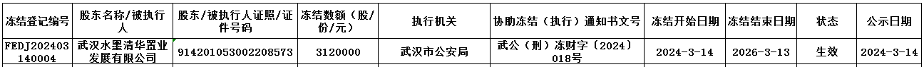 依據(jù)武漢市公安局《協(xié)助凍結財產通知書》[武公(刑)凍財字〔2024〕018號]文件,我中心為海南白沙長江村鎮(zhèn)銀行股份有限公司(企業(yè)代碼:893522)股東武漢水墨清華置業(yè)發(fā)展有限公司辦理股權凍結登記,具體情況如下: