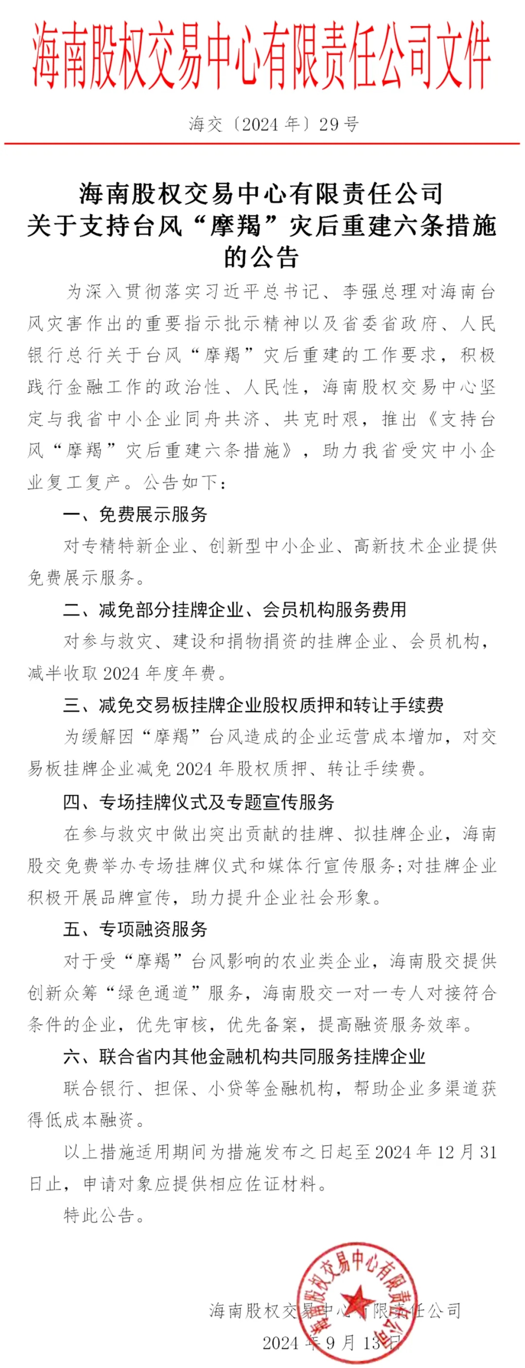 全力以“復(fù)”助力企業(yè)災(zāi)后復(fù)工復(fù)產(chǎn) 海南股交推出《支持臺(tái)風(fēng)“摩羯”災(zāi)后重建六條措施》