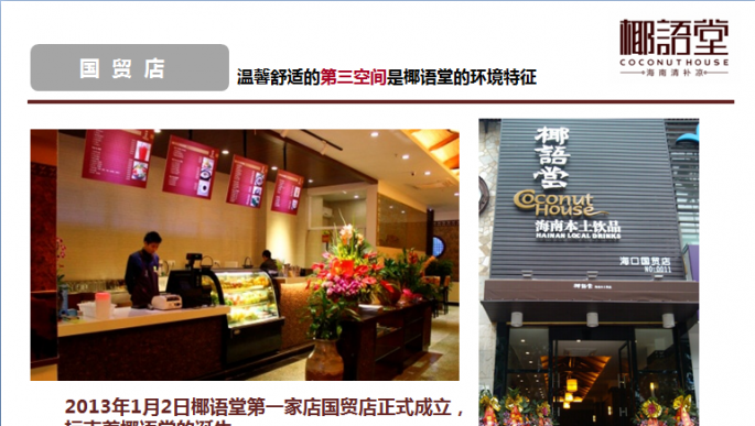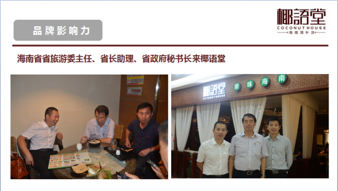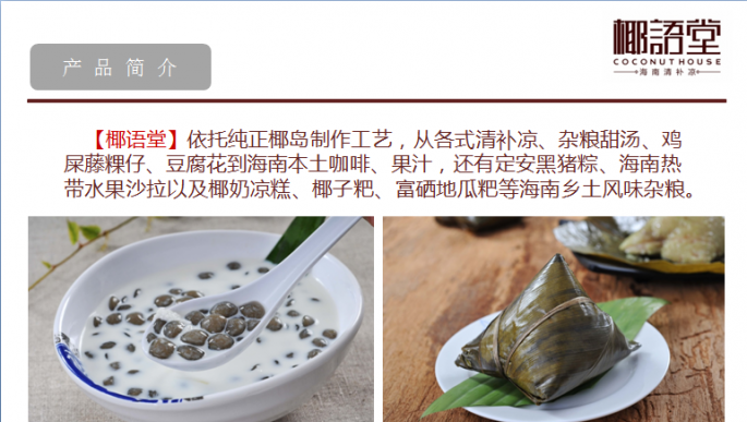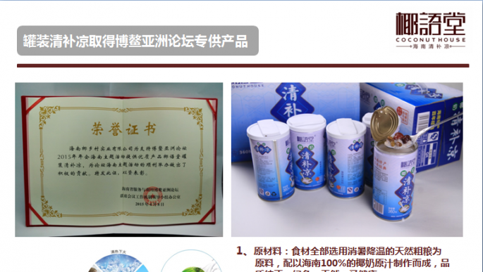 海南椰鄉(xiāng)村實(shí)業(yè)有限公司是海南省工商行政管理局批準(zhǔn)成立的有限責(zé)任公司,公司注冊(cè)資金2300萬(wàn),在職員工103人。公司下轄全資子公司??谝Z(yǔ)堂餐飲文化有限公司及??谝Z(yǔ)堂食品營(yíng)養(yǎng)科學(xué)研究院。公司根據(jù)發(fā)展目前分為三個(gè)事業(yè)部:椰語(yǔ)堂店面連鎖事業(yè)部、產(chǎn)品事業(yè)部、椰語(yǔ)堂食品營(yíng)養(yǎng)科學(xué)研究院。椰語(yǔ)堂店面連鎖事業(yè)部主要負(fù)責(zé)椰語(yǔ)堂連鎖店面的擴(kuò)張和關(guān)聯(lián)產(chǎn)業(yè)的拓展業(yè)務(wù);產(chǎn)品事業(yè)部主要負(fù)責(zé)以罐裝清補(bǔ)涼等快消品市場(chǎng)的開(kāi)拓,如目前所進(jìn)行的椰語(yǔ)堂椰奶清補(bǔ)涼工業(yè)化項(xiàng)目就是最具代表性的一項(xiàng)研究工作;椰語(yǔ)堂食品營(yíng)養(yǎng)科學(xué)研究院主要為椰語(yǔ)堂本身和第三方進(jìn)行有關(guān)食品營(yíng)養(yǎng)、配餐、產(chǎn)品研發(fā)等方面的工作,未來(lái)是椰語(yǔ)堂核心競(jìng)爭(zhēng)力的重要部分。 椰語(yǔ)堂是海南首家把海南本土以清補(bǔ)涼為代表的小吃精致化、系統(tǒng)化、標(biāo)準(zhǔn)化和研發(fā)體系化并進(jìn)行連鎖發(fā)展的企業(yè),公司致力于傳播海南文化、打造海南本土休閑美食的第一品牌。公司成立于2012年,并創(chuàng)立【椰語(yǔ)堂】品牌, 現(xiàn)已在海南望海國(guó)際廣場(chǎng)、南亞廣場(chǎng)、中山路騎樓老街、美蘭國(guó)際機(jī)場(chǎng)、上邦商業(yè)廣場(chǎng)、天涯海角景區(qū)、??谀蟻啅V場(chǎng)、廣東中山市、??趪?guó)貿(mào)大道正昊店、三亞亞龍灣熱帶天堂森林公園、??谟颜x廣場(chǎng)店等地開(kāi)設(shè)11家連鎖店并開(kāi)始北京、天津、遼寧、江蘇等島外市場(chǎng)的拓展,由于其濃郁的海南本土特色和優(yōu)秀的品質(zhì)感受到社會(huì)各界的廣泛好評(píng),椰語(yǔ)堂椰奶清補(bǔ)涼等六款小吃被餐飲行業(yè)權(quán)威機(jī)構(gòu)海南省烹飪協(xié)會(huì)、海南省瓊菜研究中心評(píng)為海南名小吃和海南瓊菜(風(fēng)味小吃)一級(jí)品牌名店。央視CCTV-2、旅游衛(wèi)視、海南電視臺(tái)、內(nèi)蒙衛(wèi)視、海南日?qǐng)?bào)、航空高端雜志【云端】、中國(guó)美食第一刊【東方美食】【餐飲經(jīng)理人】、【勇闖地球主持人伊恩.萊特】、【新浪美食】、【南島視界】、【海南旅游商品協(xié)會(huì)雜志創(chuàng)刊號(hào)】、去哪兒吃【海南美食】食尚海南等國(guó)內(nèi)外知名媒體都進(jìn)行了宣 傳報(bào)道,成為了海南文化的傳播和弘揚(yáng)者,并打造成展示海南國(guó)際旅游島本土文化的一張亮麗名片。 海南椰鄉(xiāng)村實(shí)業(yè)有限公司注冊(cè)成立了“海口椰語(yǔ)堂食品營(yíng)養(yǎng)科學(xué)研究院”并和海南大學(xué)食品學(xué)院深度合作,充分利用海南大學(xué)食品學(xué)院的科研力量和實(shí)驗(yàn)設(shè)備,集結(jié)了海南大學(xué)和其它領(lǐng)域的教授、專家,進(jìn)行產(chǎn)品的研發(fā)和標(biāo)準(zhǔn)的制定,定期進(jìn)行營(yíng)養(yǎng)成分抽檢和出品品質(zhì)監(jiān)控,旨在為消費(fèi)者提供食品更加安全、營(yíng)養(yǎng)更加豐富、品種更加齊全的海南本土特色休閑美食。 2014年,政府為發(fā)展海南省地方特色產(chǎn)業(yè),從眾多的申報(bào)項(xiàng)目中篩選后對(duì)我司進(jìn)行了300萬(wàn)人民幣股權(quán)投資。 2014年12月,我司受邀參加2014年中國(guó)(海南)國(guó)際熱帶農(nóng)產(chǎn)品冬季交易會(huì),我司推出的“椰語(yǔ)堂罐裝清補(bǔ)涼”在海南省品牌館和海口市品牌館進(jìn)行展示。本產(chǎn)品原材料全部選用消暑降溫的天然粗糧為原料,配以海南100%的椰奶原汁制作而成,品質(zhì)純正、綠色、天然又健康,清涼可口、營(yíng)養(yǎng)又健康。通過(guò)此次展會(huì),“椰語(yǔ)堂罐裝清補(bǔ)涼”贏得了島內(nèi)外顧客的一致好評(píng),成為此次冬交會(huì)上獨(dú)具一格的風(fēng)景。 2015年3月,我司“椰語(yǔ)堂罐裝清補(bǔ)涼”正式成為亞洲博鰲論壇專供產(chǎn)品,為世界各國(guó)領(lǐng)導(dǎo)人所品用。 目前在??跈C(jī)場(chǎng)、??谥寥齺唲?dòng)車(chē)、廣深高鐵、部分商場(chǎng)、淘寶等互聯(lián)網(wǎng)渠道已經(jīng)開(kāi)始椰語(yǔ)堂灌裝清補(bǔ)涼產(chǎn)品的銷(xiāo)售。 |